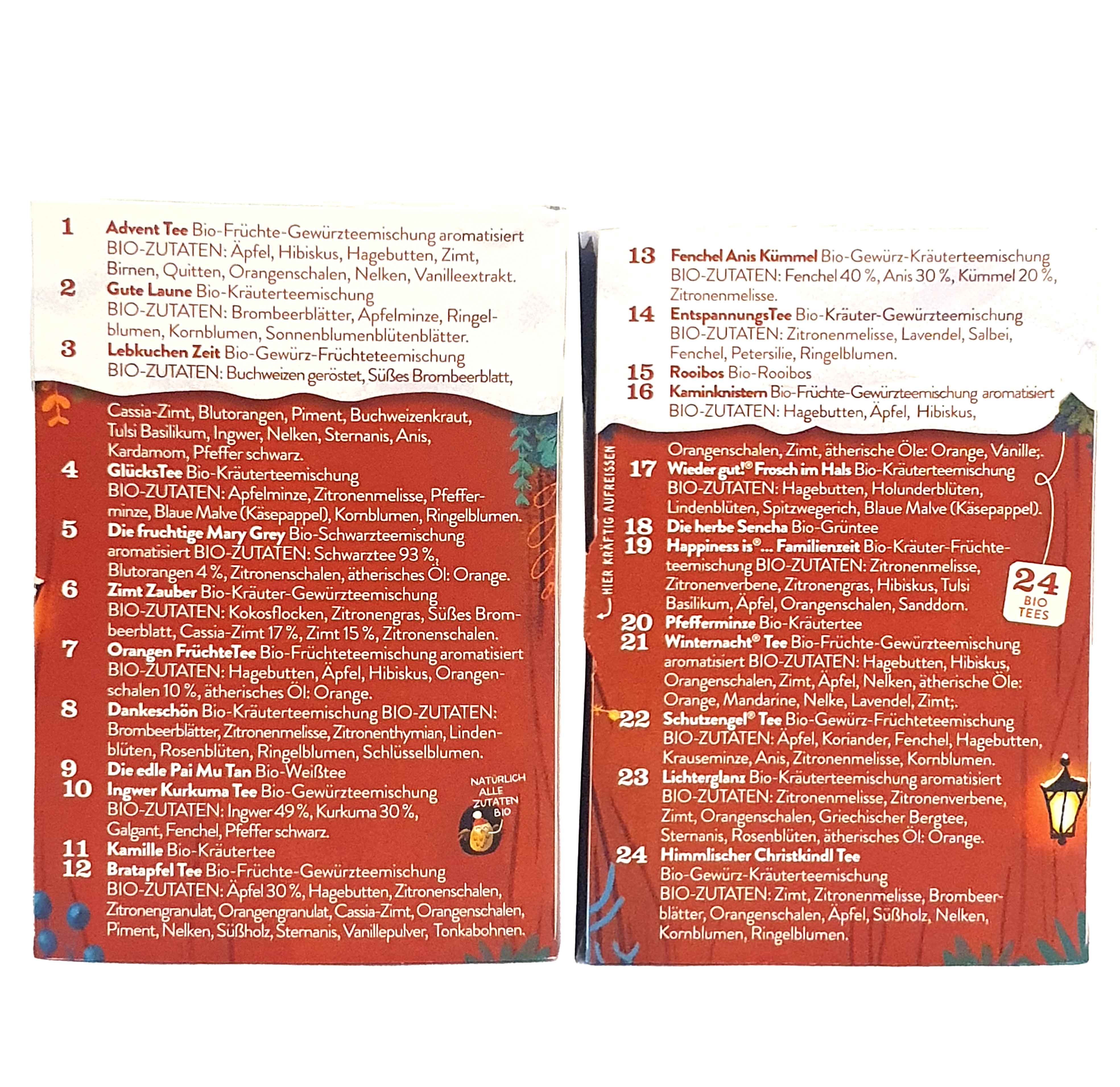 24. HIMMLISCHER CHRISTKINDL TEE: Zimt bio, Zitronenmelisse bio, Brombeerblätter bio, Orangenschalen bio, Äpfel bio, Süßholz bio, Nelken bio, Kornblumen bio, Ringelblumen bio.