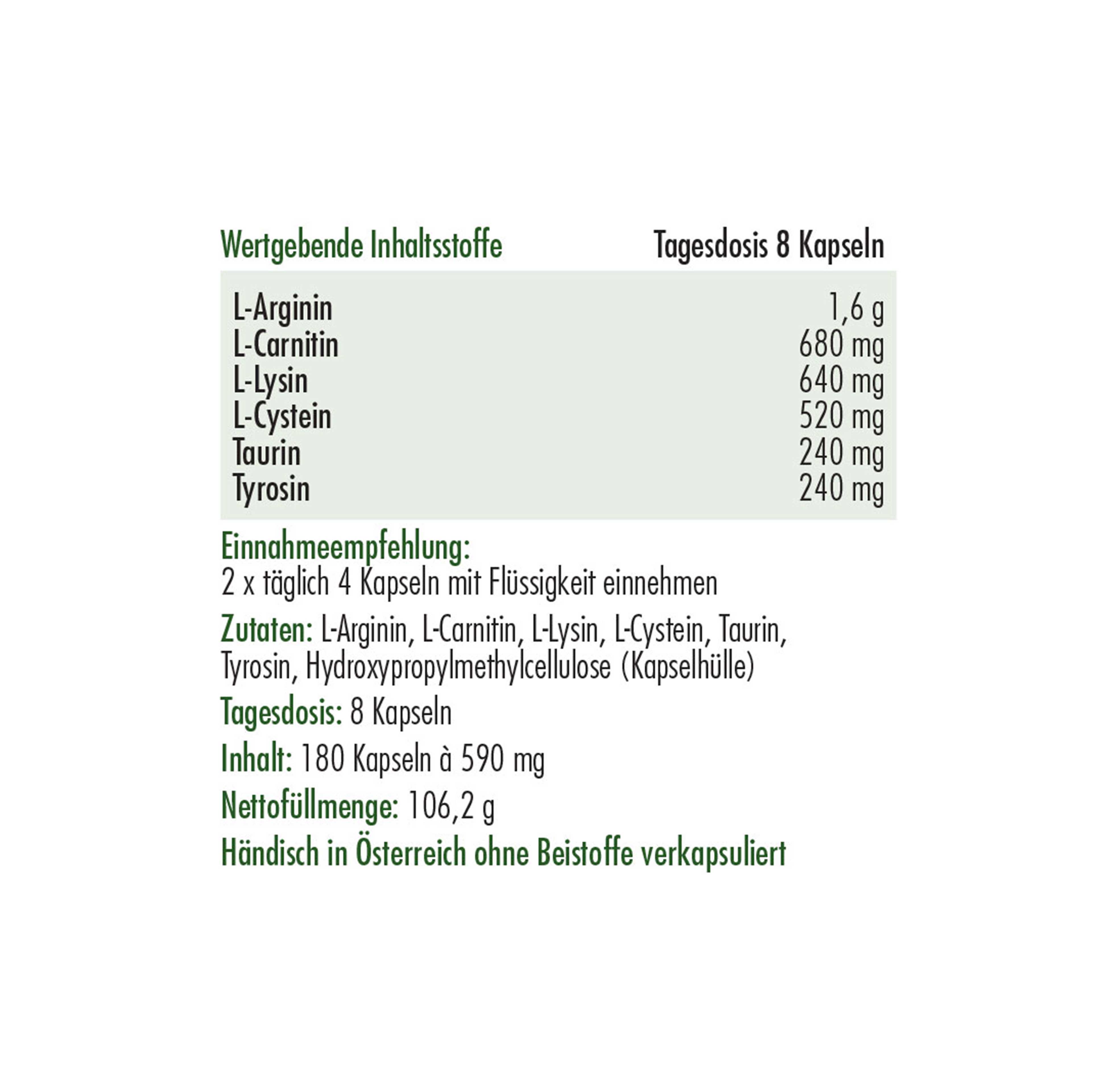 - Enthält die Aminosäuren L-Arginin, L-Cystein, L-Lysin, L-Carnitin, Tyrosin, Taurin