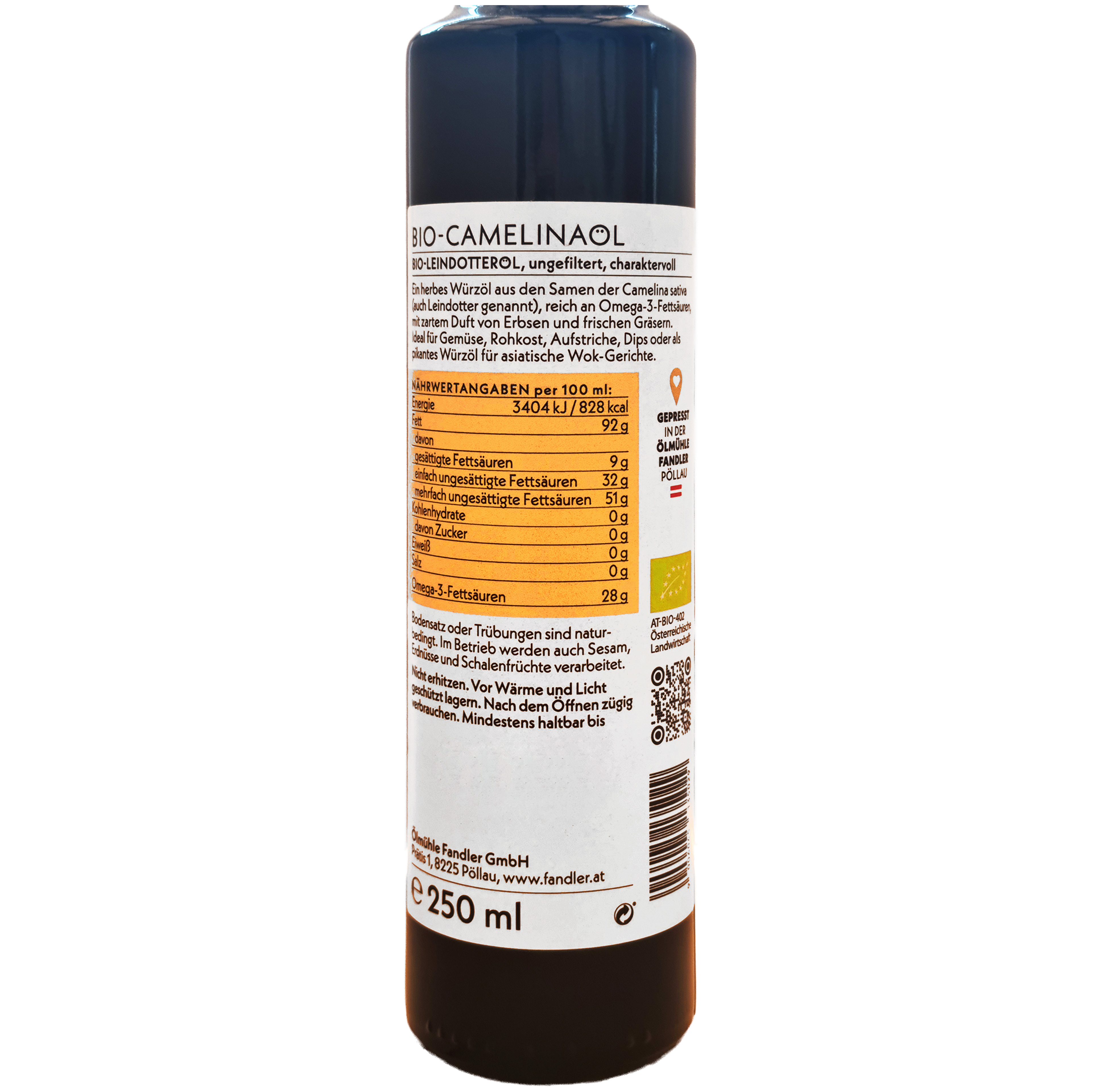 Seit über 90 Jahren steht die Ölmühle Fandler für handwerkliche Perfektion und höchste Sorgfalt. Das Camelinaöl in Bio-Qualität wird schonend und ohne Zusätze gepresst – für einen naturbelassenen Genuss, der die Reinheit der Pflanze bewahrt. Kontrolliert biologischer Anbau und strenge Qualitätskriterien machen dieses Öl zu einem echten Premiumprodukt. Jede Flasche ist Ausdruck von Nachhaltigkeit, Ehrlichkeit und feinem Geschmack.