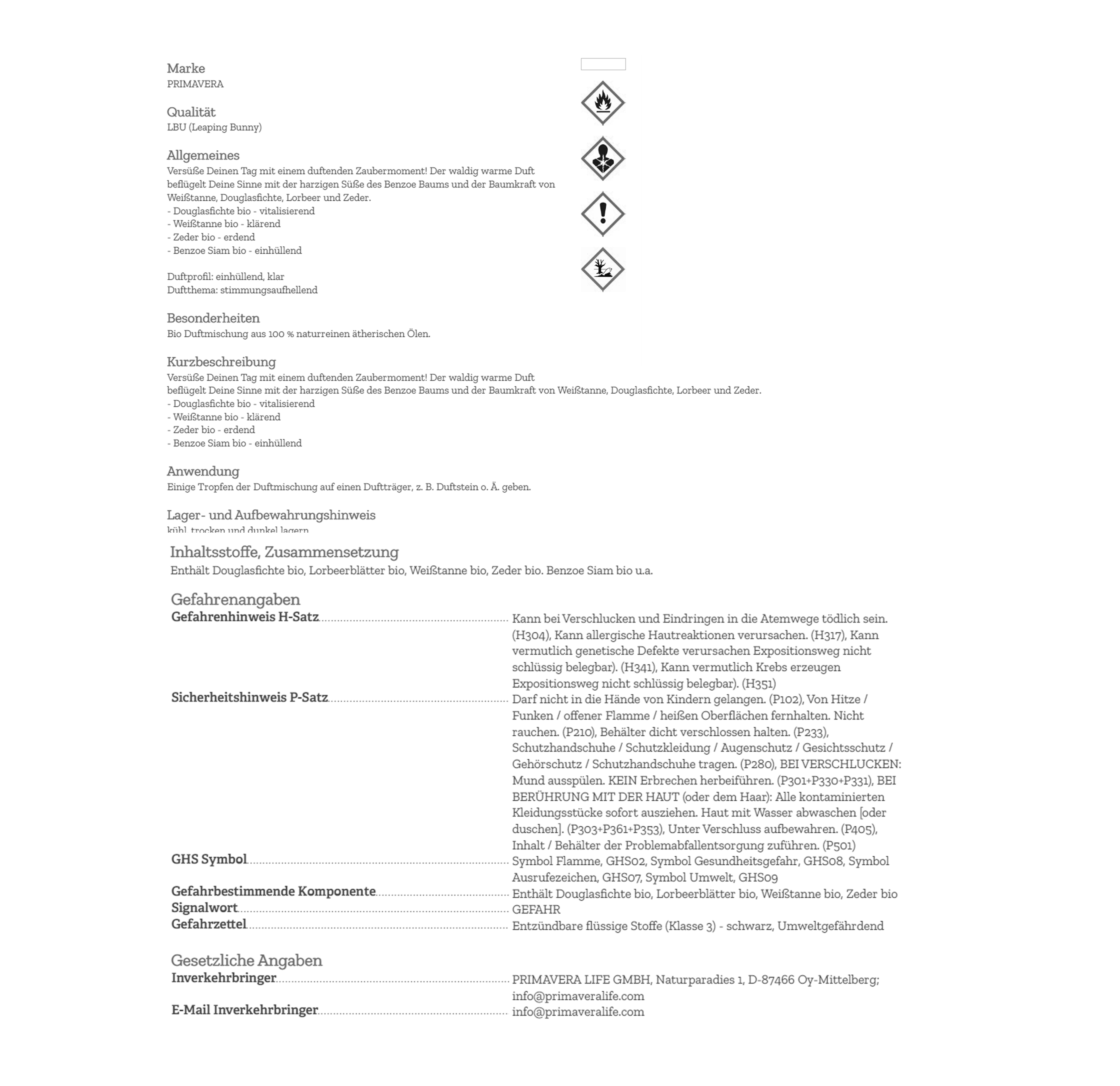 Der waldig warme Duft beflügelt Deine Sinne mit der harzigen Süße des Benzoe Baums und der Baumkraft von Weißtanne, Douglasfichte, Lorbeer und Zeder.