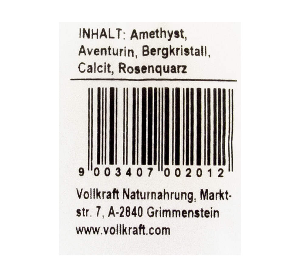 Rosenquarz (Harmonie), Bergkristall (Klarheit), Amethyst (Spiritualität), Aventurin (Vitalität) und Aragonit (Wachstum). Vor der ersten Anwendung und wöchentlich sollten die Steine zur Aufladung für einige Stunden in die Sonne gelegt werden.