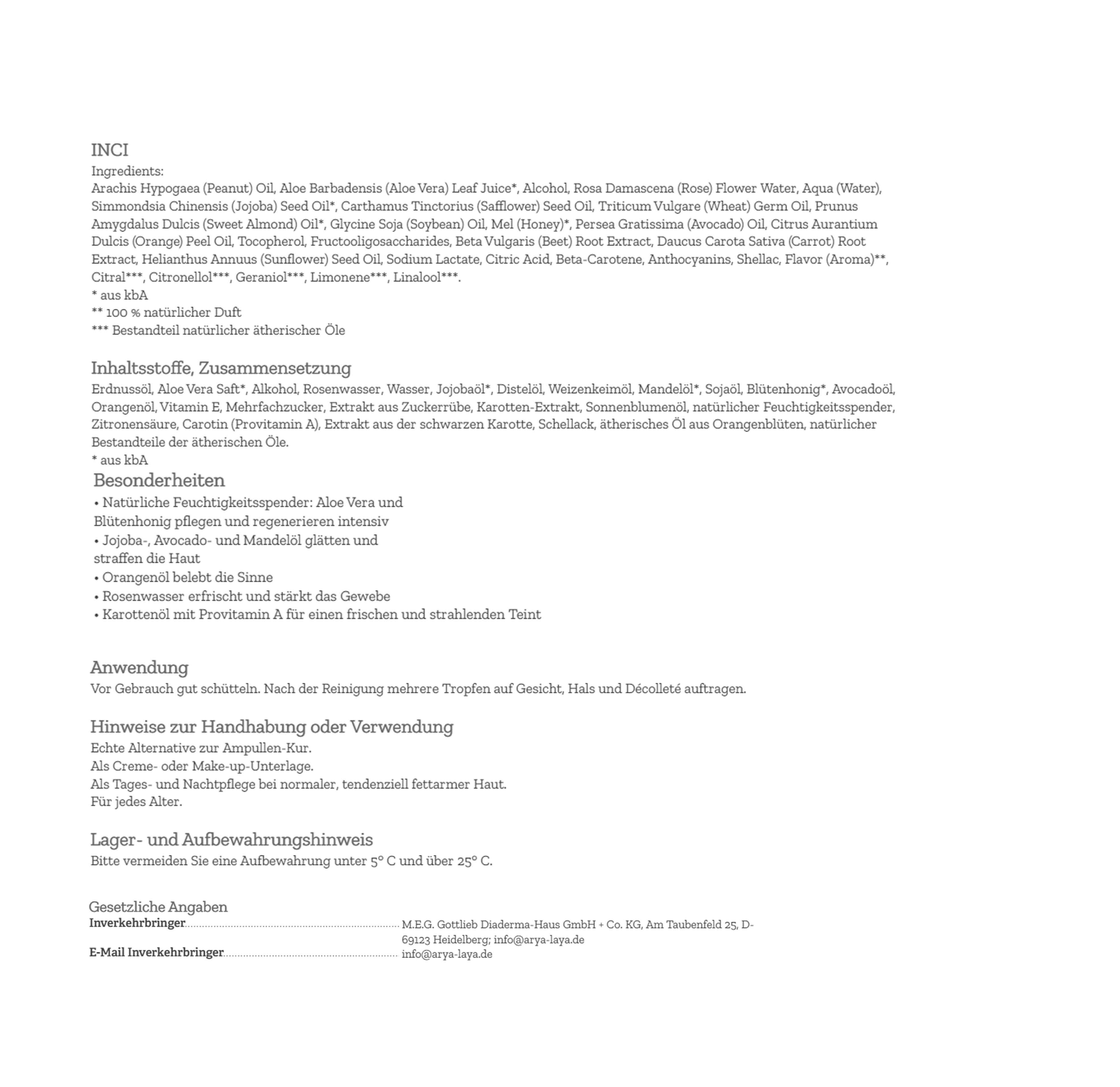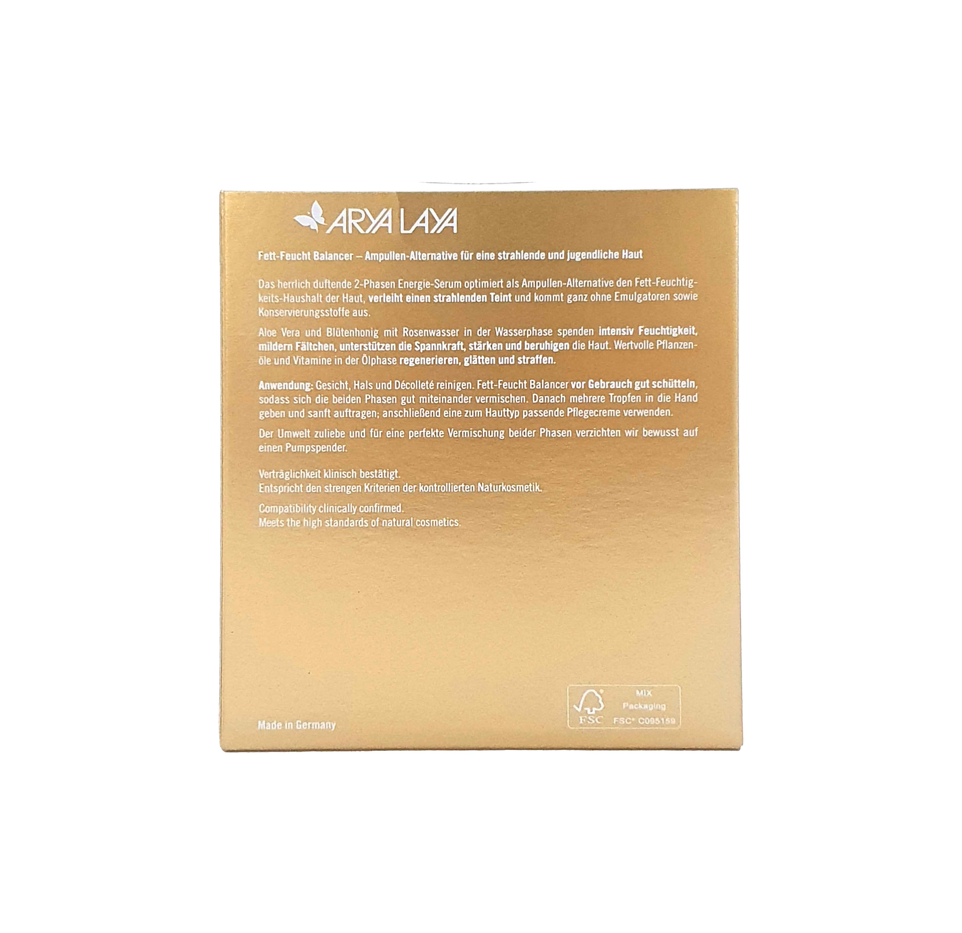 Entdecken Sie den Arya Laya Fett-Feucht-Balancer, eine innovative Ampullen-Alternative, die Ihre Haut intensiv mit Feuchtigkeit versorgt und für ein jugendliches Strahlen sorgt. Ein herrlich duftendes 2-Phasen Serum, das ein strahlend frisches Aussehen schenkt. Kostbare Pflanzenöle und Vitamine regenerieren intensiv, reichhaltige Feuchtigkeitsspender wie Aloe Vera, Blütenhonig und Rosenwasser beleben Ihre Haut, mildern erste Fältchen und unterstützen die Spannkraft. Ideal als leichte Tagespflege und Make-up-Unterlage. Ohne Emulgatoren.