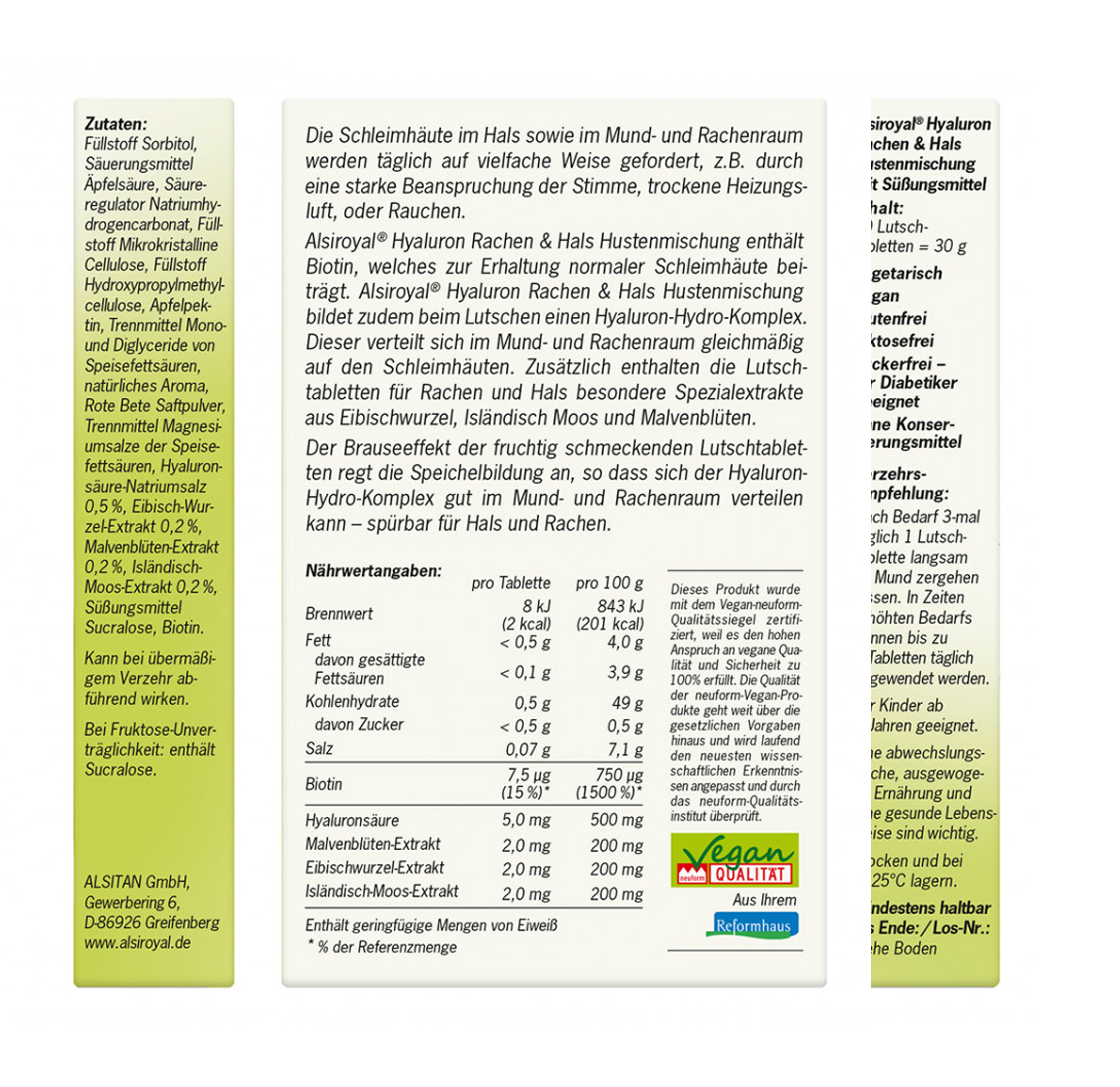Die Hyaluron Rachen & Hals Lutschtabletten von Alsiroyal umhüllen Hals und Rachen wie ein sanfter Schutzfilm. Hochwertige Hyaluronsäure bindet Feuchtigkeit dort, wo sie gebraucht wird, und sorgt für ein angenehm gepflegtes Gefühl – ideal bei trockener Luft, starker Beanspruchung der Stimme oder in der Erkältungszeit. Jede Lutschtablette schmilzt langsam und entfaltet ihre wohltuende Wirkung Schritt für Schritt.