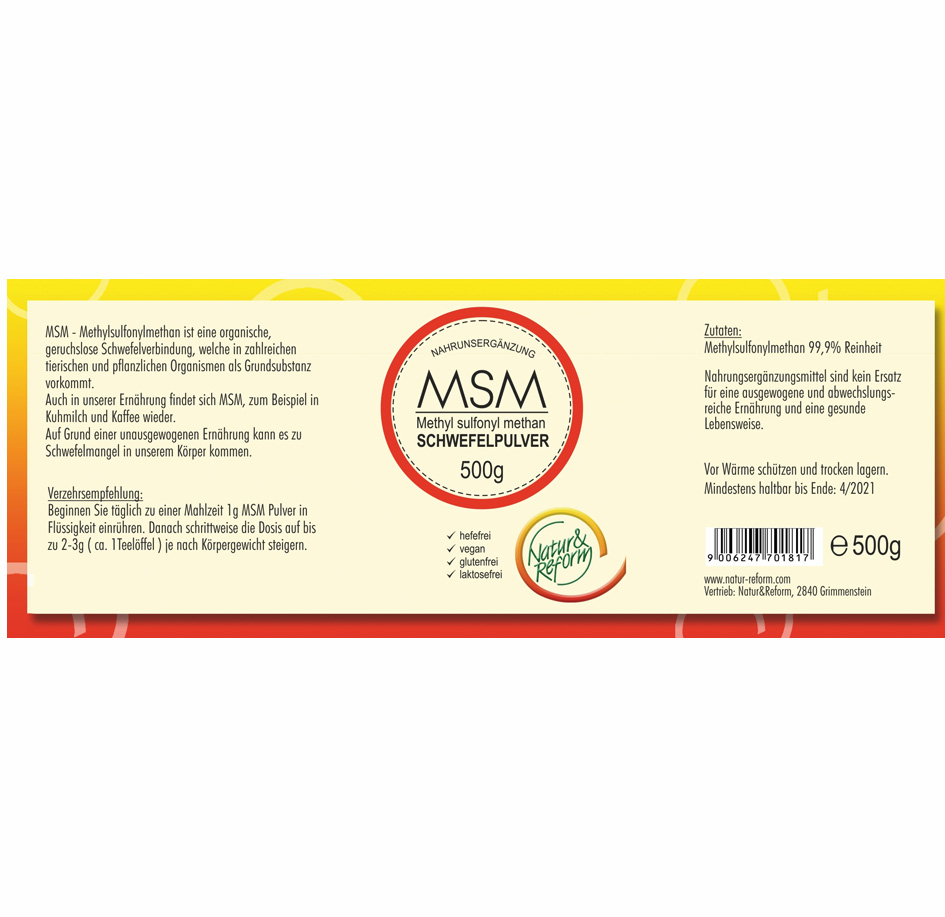 MSM (Methylsulfonylmethan) ist eine organische Schwefelverbindung, die in vielen tierischen und pflanzlichen Organismen vorkommt. Beim Menschen kann Schwefelmangel durch unausgewogene Ernährung entstehen. MSM Pulver kann diesen Mangel ausgleichen und wird zur Behandlung von Schmerzen, Entzündungen, Asthma, Allergien, Krämpfen, Rheuma, Akne, Diabetes, Verdauungsproblemen, Parasiten, Giftstoffansammlungen, Quecksilberausleitung und Migräne verwendet.