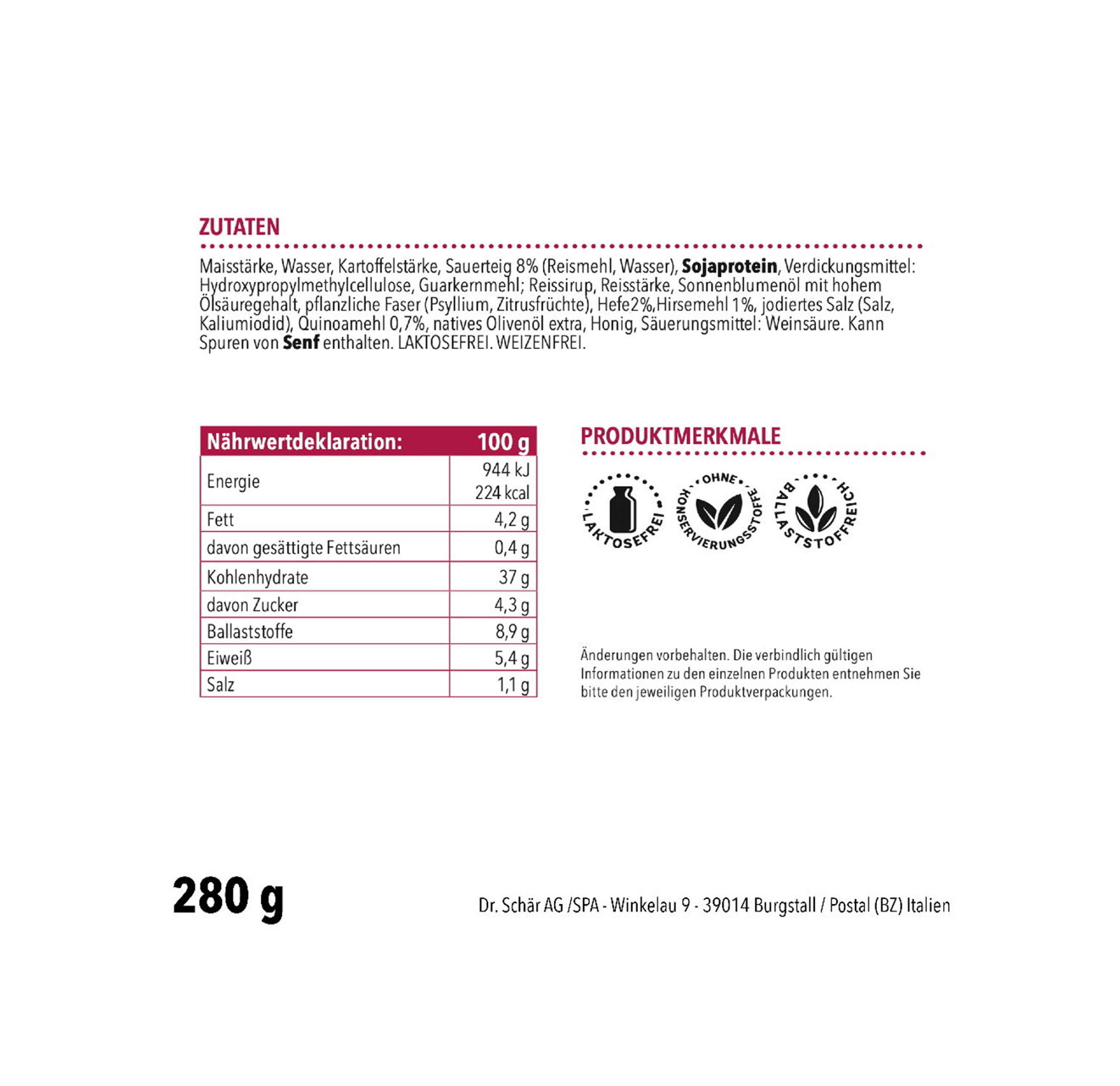 Zusätze: Sojaprotein, pflanzliche Fasern (Flohsamenschalen, Zitrusfaser), Reissirup, Reisstärke, Hirsemehl (1%), Quinoamehl (0,7%), Natives Olivenöl extra, Honig, Sonnenblumenöl mit hohem Ölsäuregehalt, Jodiertes Speisesalz (Salz, Kaliumiodid), Säuerungsmittel: Weinsäure, Hydroxypropylmethylcellulose, Guarkernmehl.